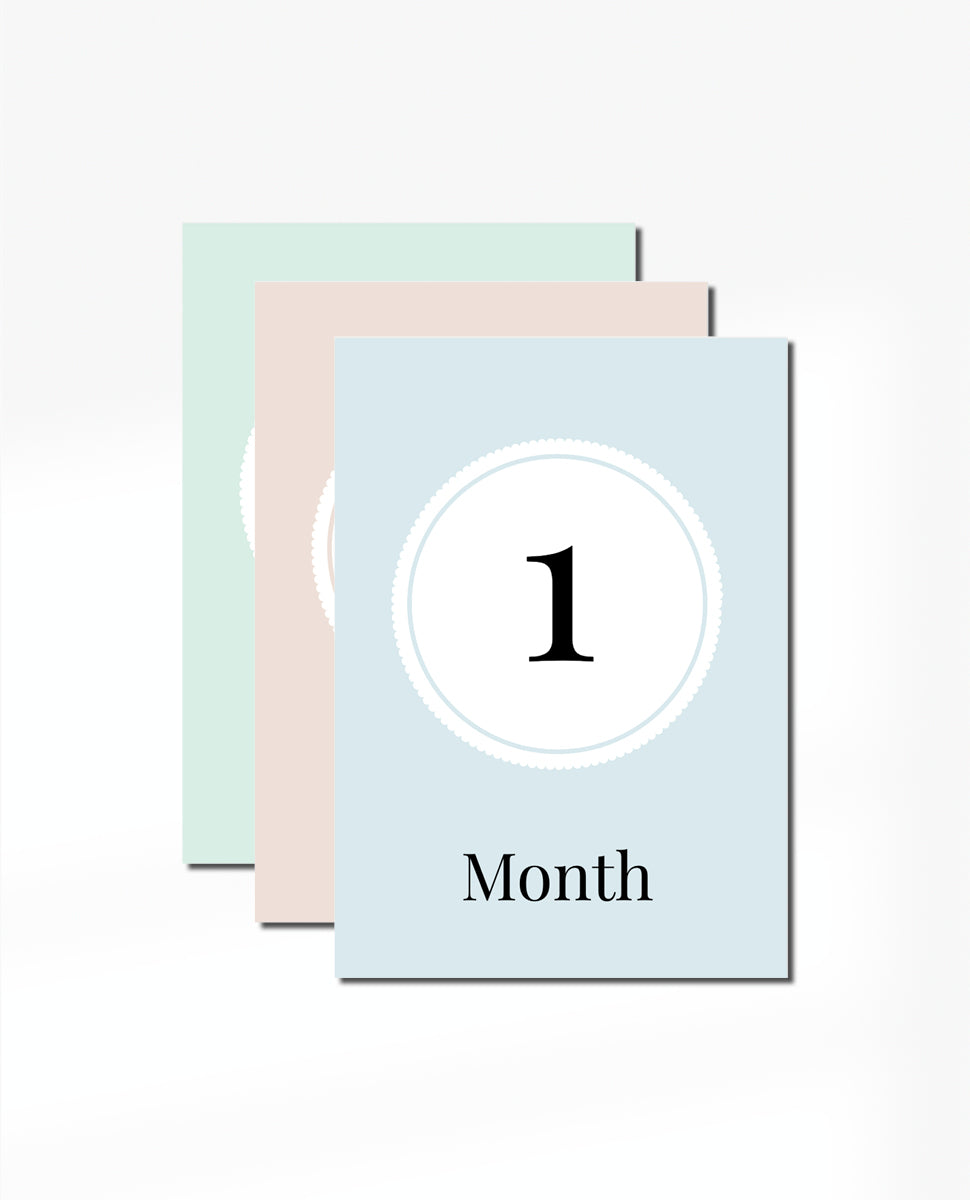 Document your baby's growth with taking a picture monthly with cute cards. Our simple digital cards circle and the age of the baby in the colors you choose. You can download as many cards in different colors as you need. Print them at home & save on shipping.